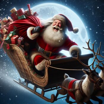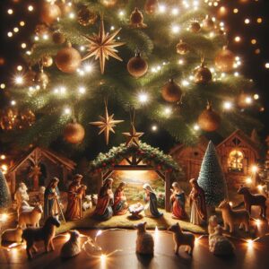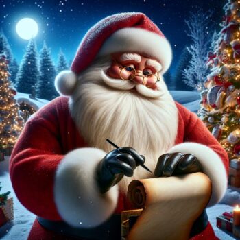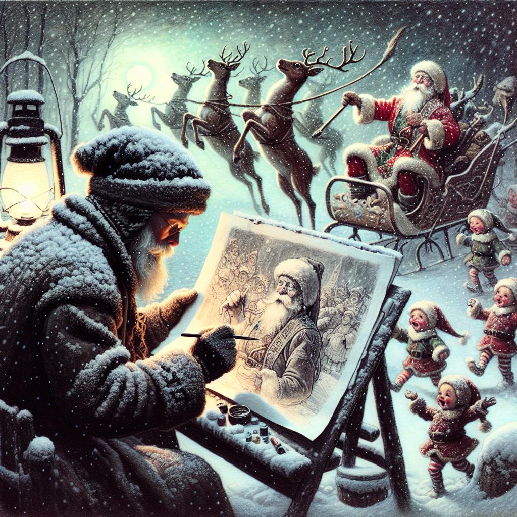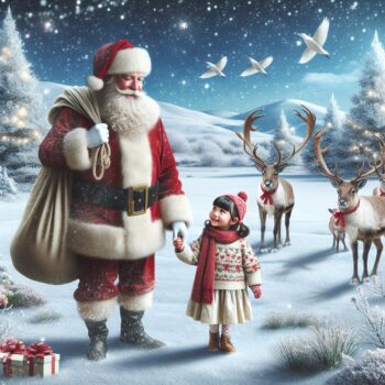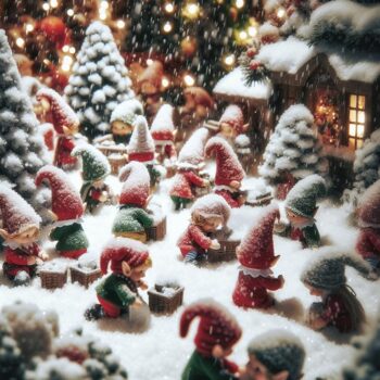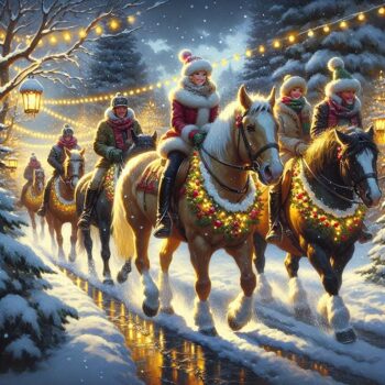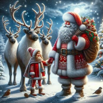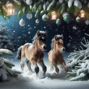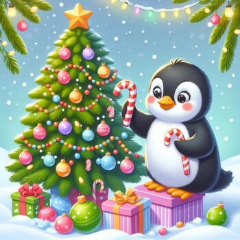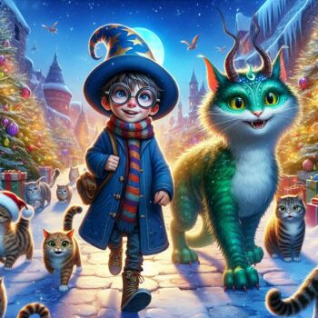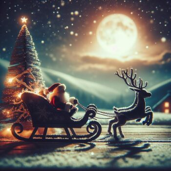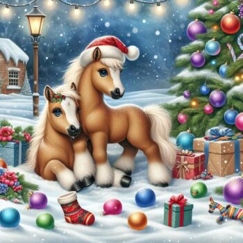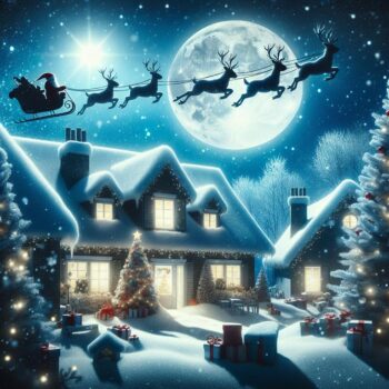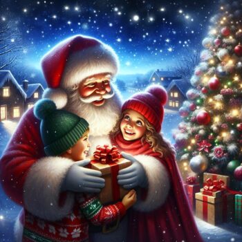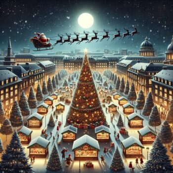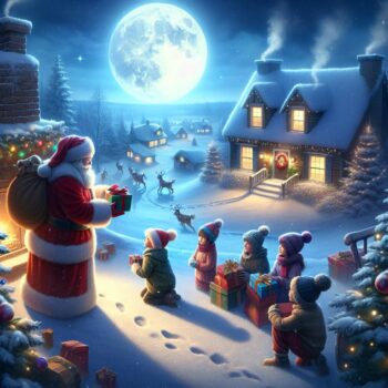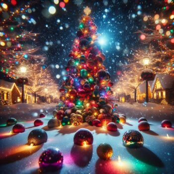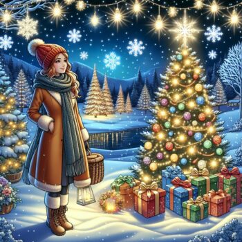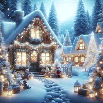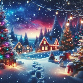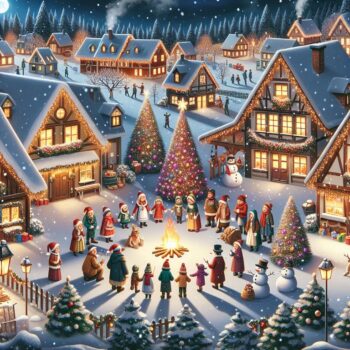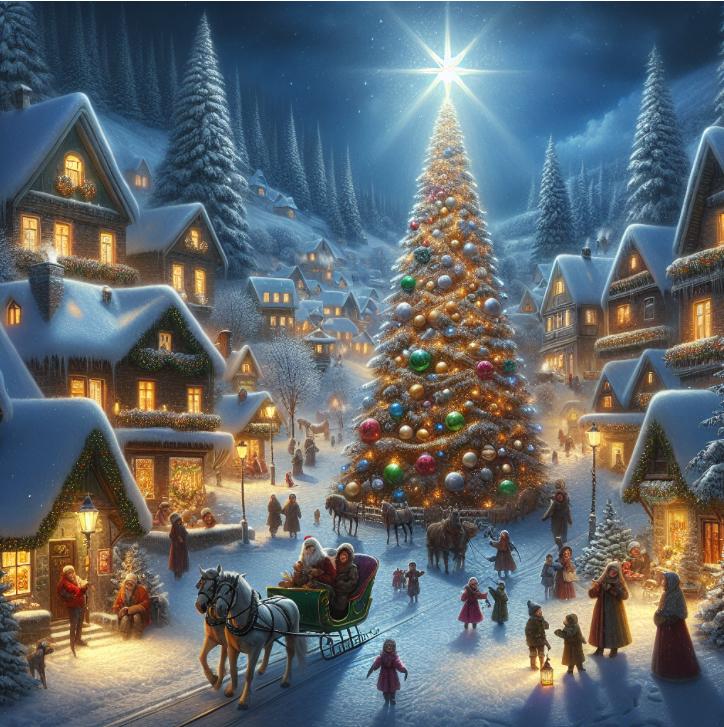 Es war ein friedlicher Abend, und das Dorf lag still und eingehüllt in einer dicken Schneeschicht, die im Mondlicht glitzerte. Rundherum standen große Tannen, deren Äste voll von glitzernden Schneeflocken waren. Die kalte Luft roch nach frisch gebackenen Plätzchen und heißem Kakao, und irgendwo konnte man leise Glocken hören, die mit dem Lachen von spielenden Kindern zusammenklangen. In der Mitte des Dorfes stand ein riesiger Weihnachtsbaum, der über und über mit Lichtern und Kugeln geschmückt war. Ganz oben funkelte ein großer Stern, der so hell leuchtete, dass man ihn von überall sehen konnte. Um den Baum herum hatten sich die Dorfbewohner versammelt. Manche hielten warme Tassen in den Händen, während andere miteinander redeten und lachten. Kinder mit roten Wangen rannten umher, warfen Schneebälle und bauten Schneemänner. Ein Pferdeschlitten fuhr langsam die Hauptstraße entlang. Die Glocken an den Pferden klangen fröhlich, und der Fahrer winkte den Leuten zu. Die Häuser am Rand der Straße waren mit bunten Lichtern geschmückt, und aus den Fenstern kam ein warmes, gemütliches Licht. Die Menschen begrüßten sich, tauschten kleine Geschenke aus und wünschten sich frohe Weihnachten. Es fühlte sich an, als ob das ganze Dorf ein großes Fest feierte. Oben am Himmel leuchteten die Sterne, und es schneite ganz leise. Die Schneeflocken sahen aus wie kleine Diamanten, die vom Himmel fielen. In diesem Moment war alles so friedlich, dass man das Gefühl hatte, die Zeit würde stehen bleiben. Es war, als ob der ganze Zauber von Weihnachten in diesem kleinen Dorf lebendig wurde.