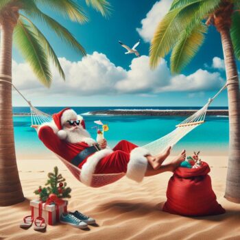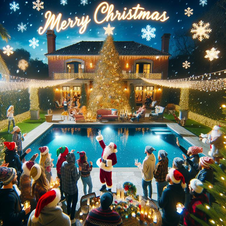 … feiert eine Weihnachtsfeier in seinen Garten mit Pool.Es schneit,alles ist mit Lichterketten geschmückt.Im Himmel steht Merry Christmas.Im Garten steht ein riesiger Tannenbaum, der geschmückt ist mit ganz viel Weihnachtsschmuck.Über dem Weihnachtsbaum flieg … der Weihnachtsmann in seinem schlichten. … hat eine Weihnachtsmütze an. Eingeladen sind ….