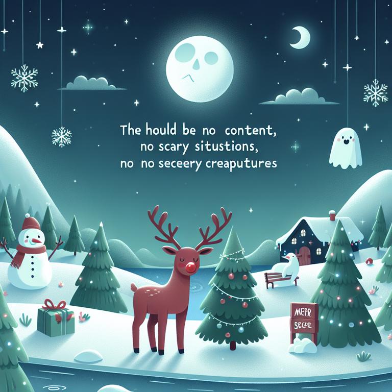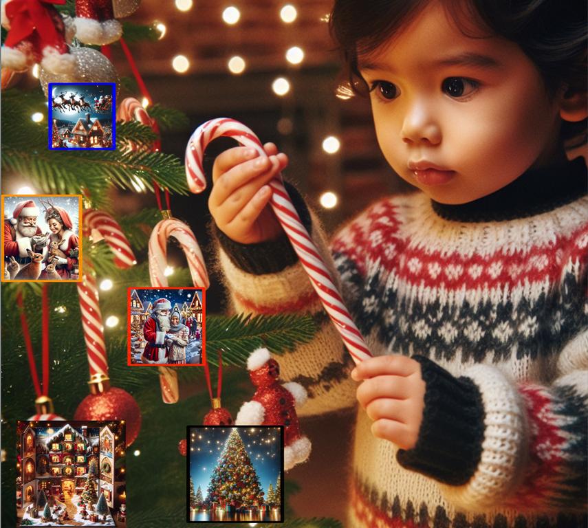 Kleiner Junge mit einer Zuckerstange in der Hand. Riesiger Weihnachtsbaum mit Sternennacht. Adventskalender in denen Türchen Weihnachtsszenen sind. Weihnachtsmann mit einem Mädchen. Weihnachtsmann mit Weihnachtsfrau und Kaninchen. Rudolph und die Rentiere fliegen mit Weihnachtsmann durch die Sternennacht.