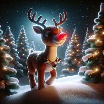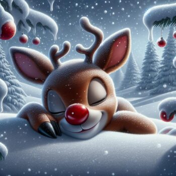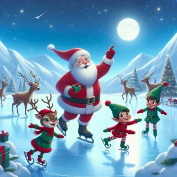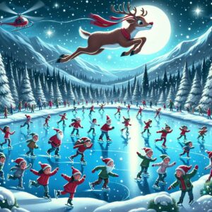Rudolph flieg über einen eingefrorenen Teich, wo viele Kinder drauf Schlittschuh fahren. Der Himmel ist dunkel und es schneit.