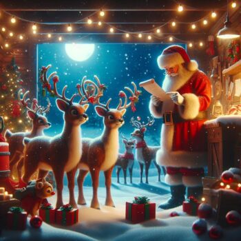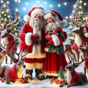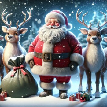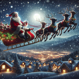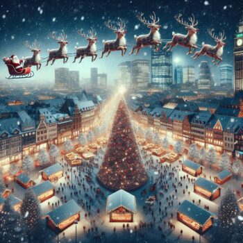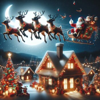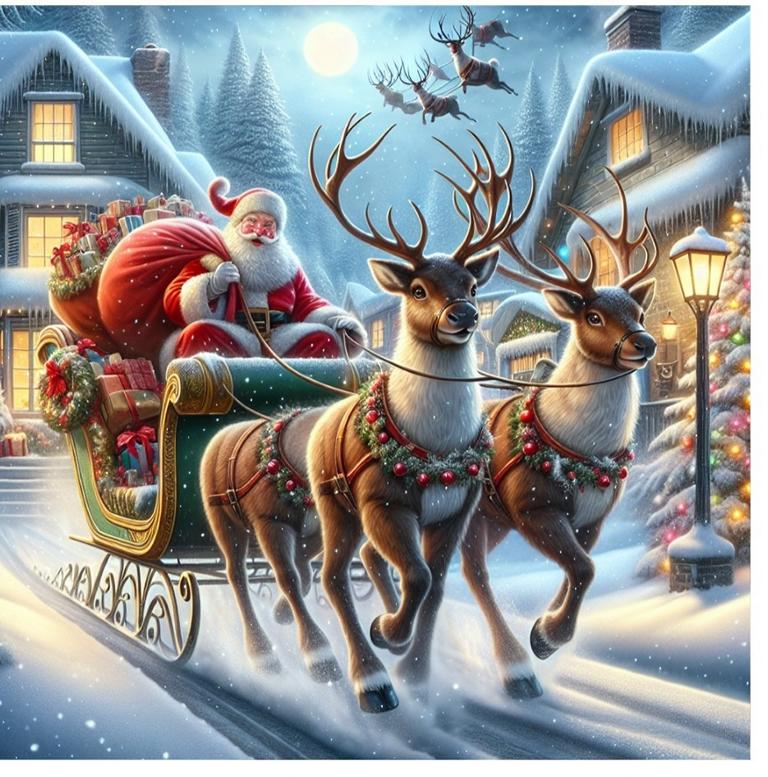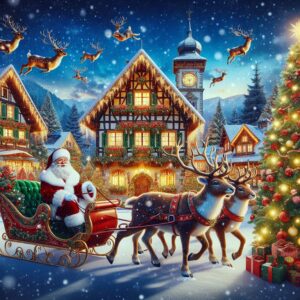 Auf dem Foto soll ein Rentierschlitten mit dem Weihnachtsmann sein. Im Hintergrund sind alte bayrische Häuser, die schön geschmückt sein sollen. Nebenbei soll es schneien. Am Rand soll ein großer leuchtender Tannenbaum stehen. Im Himmel fliegen Rentiere, weil sie sich auf Weihnachten freuen. Achte darauf, dass das Foto farbenfroh aussieht.