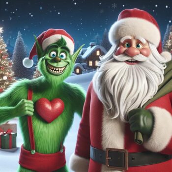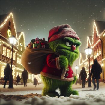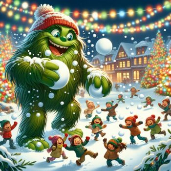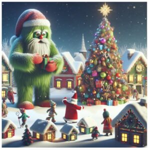 Ein großer Grinch steht im Schnee und spielt mit den Kindern. Viele bunte Häuser leuchten weit und breit auch ein großer bunter Weihnachtsbaum steht in der Mitte des Bildes. Auch der Weihnachtsmann ist dabei.