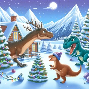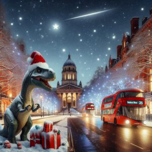 Ein Dinosaurier mit Weihnachtsmütze steht in London vor dem National History Museum. Im Hintergrund sind rote Busse. Es ist Nacht. Eine Sternschnuppe ist am Himmel. Schnee liegt auf dem Boden. Die Straßen sind festlich geschmückt. Mit bunten Lichtern.