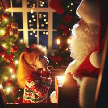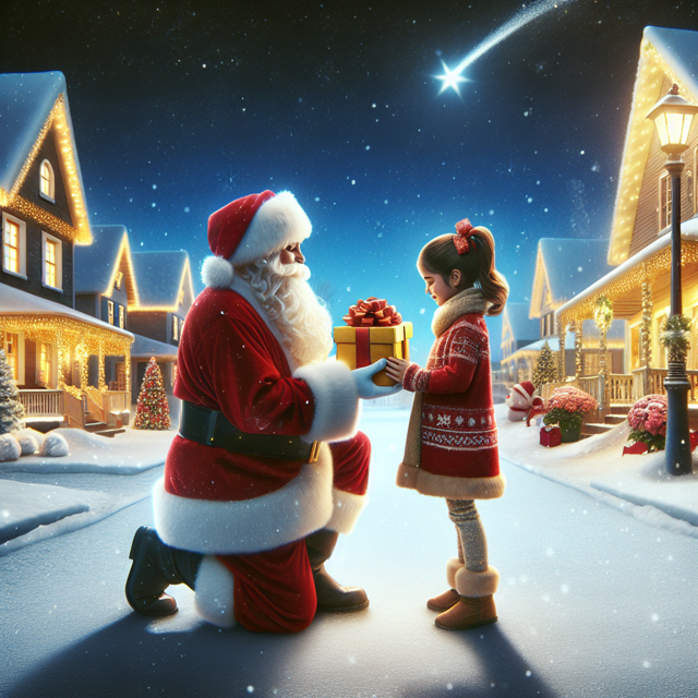 Santa bekommt von einem kleinen Mädchen ein Geschenk überreicht. Das Geschenk ist in goldenen Papier verpackt mit einer roten Schleife. Santa kniet mit einem Bein. Die Straße ist komplett mit Schnee bedeckt. Links und rechts befinden sich schön geschmückte und beleuchtete Häuser. Am Himmel fliegt eine Sternschnuppe. Das Bild soll möglichst realistisch aussehen.