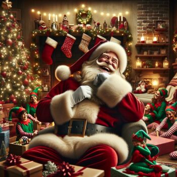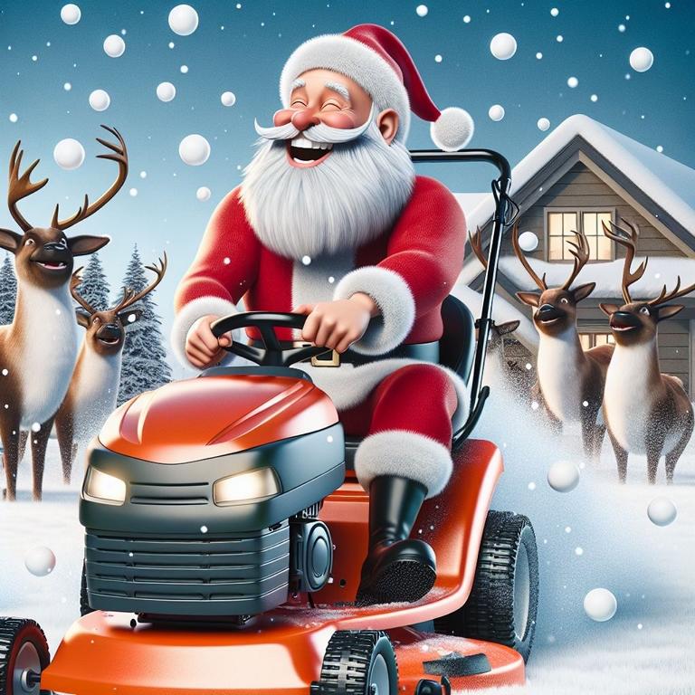Erstelle ein Bild vom Weihnachtsmann sitzend auf einem orangenem … Rasenmäher wie er sich dadrüber beschwert, dass er keinen Rasen mähen kann, weil soviel Schnee liegt. Die Rentiere im Hintergrund lachen sich schlapp und werfen mit Schneebällen.