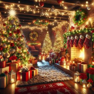 Ein Weihnachtlich geschmückter Keller, voller heller Lichtern und Weihnachtsschmuck.