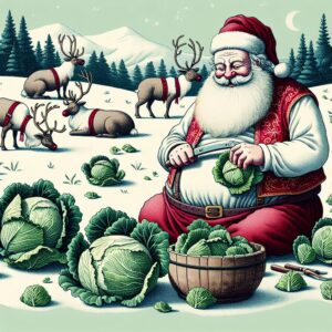Erstelle ein Bild dem Weihnachtsmann beim Kohlanschnitt. Im Hintergrund sind Rudolf und die anstehen Rentiere und fressen Kohl
