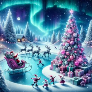 Winterwonderland mit Elfen, die auf der Schlittschuhbahn Schlittschuh fahren und Santa im Schlitten mit rentieren und einem Weihnachtsbaum und Polarlichtern.