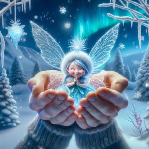 Eine kleine Eisfee mit einer Mütze auf und sie lächelt. Sie sitzt in großen Händen und dahinter eine Winterlandschaft ohne Häuser ein paar Tannenbäume die mit Schnee bedeckt sind und Polarlichter und ein paar Schneeflocken.