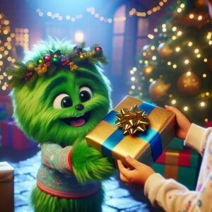 Der Grinch schenkt einen Mädchen ein Geschenk, was in blau-goldenen Papier eingepackt ist.